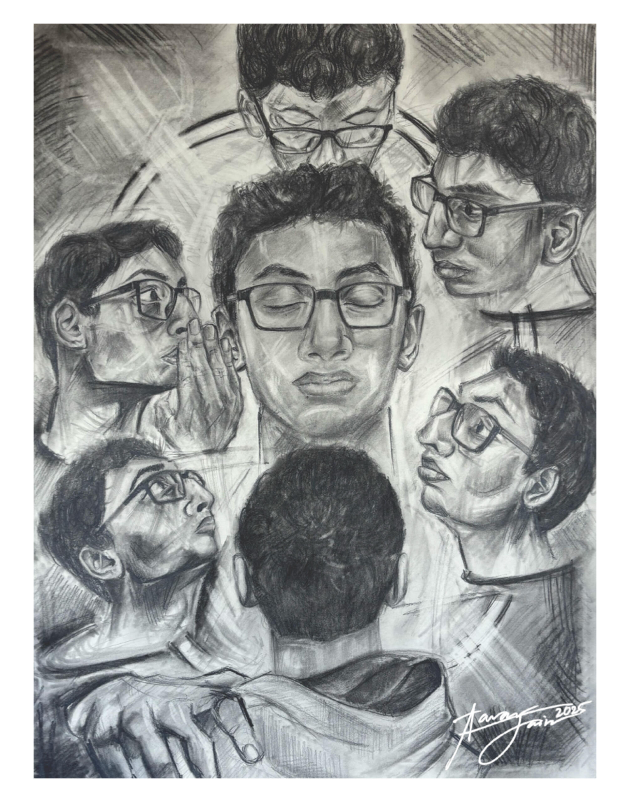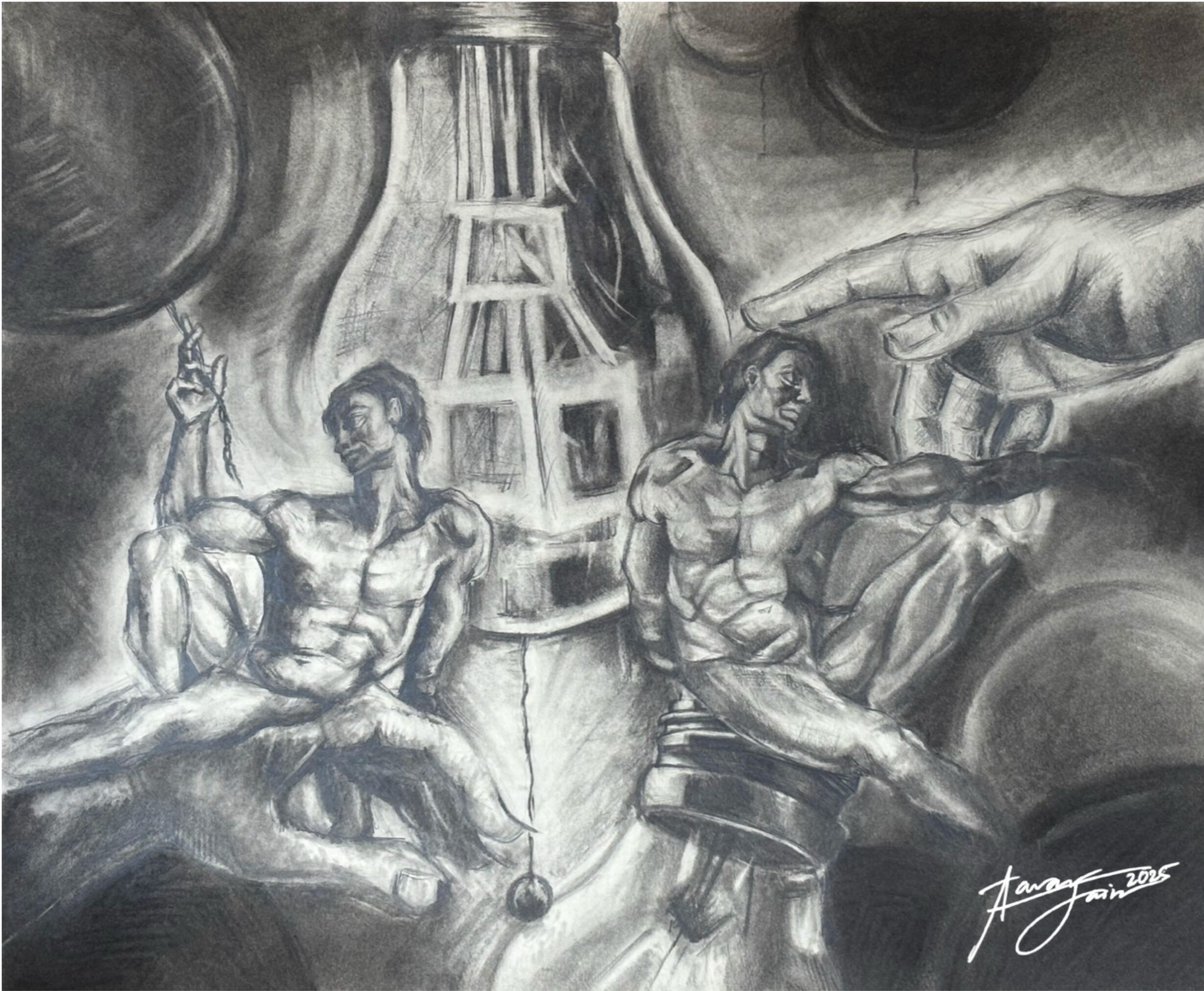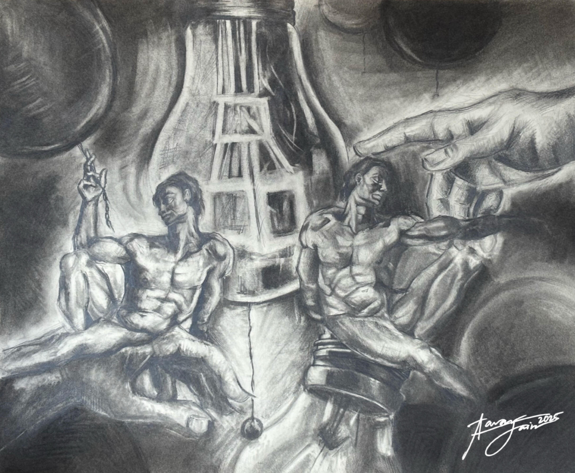 This gesture to me, though subtle, illustrates the shortcoming of humanity. Somehow, in spite of all our ambition and resolve to be good, there always seems to come a time when inspiration dries and clarity disappears. Idleness eats away, mistakes are made, and regrets fester. Alexander Pope put this painting to words, saying “to err is human; to forgive, divine.” This is the heart of my drawing, the rest only embellishment to convey the concept more elegantly.In my artwork, the figure of Adam (man) is inverted, leaving opportunity for symmetry and contrast. Similarly, two hands appear, in the top right and bottom left. Light is used as the archetypal symbol of truth, goodness, and man’s brilliance while darkness represents shortcoming. In a phrase, my drawing is about the flickering of man’s light.On the right half of the piece, the hand of God beckons man to turn towards the light. But man ignores in his typical, stubborn, irrational way, and dangles out toward the darkness. This is the typical interpretation of Michelangelo’s work as well. On the left half, though, the opposite unfolds. Man reaches out to switch on the lightbulb while the lower hand cuts the central cord of light with its fingernail.Suffice it to say, there is a constant internal battle between opposites: action vs. inaction, social vs. contemplative, and of course—good vs. evil. To me, this is (and always will be) fundamental to being human.