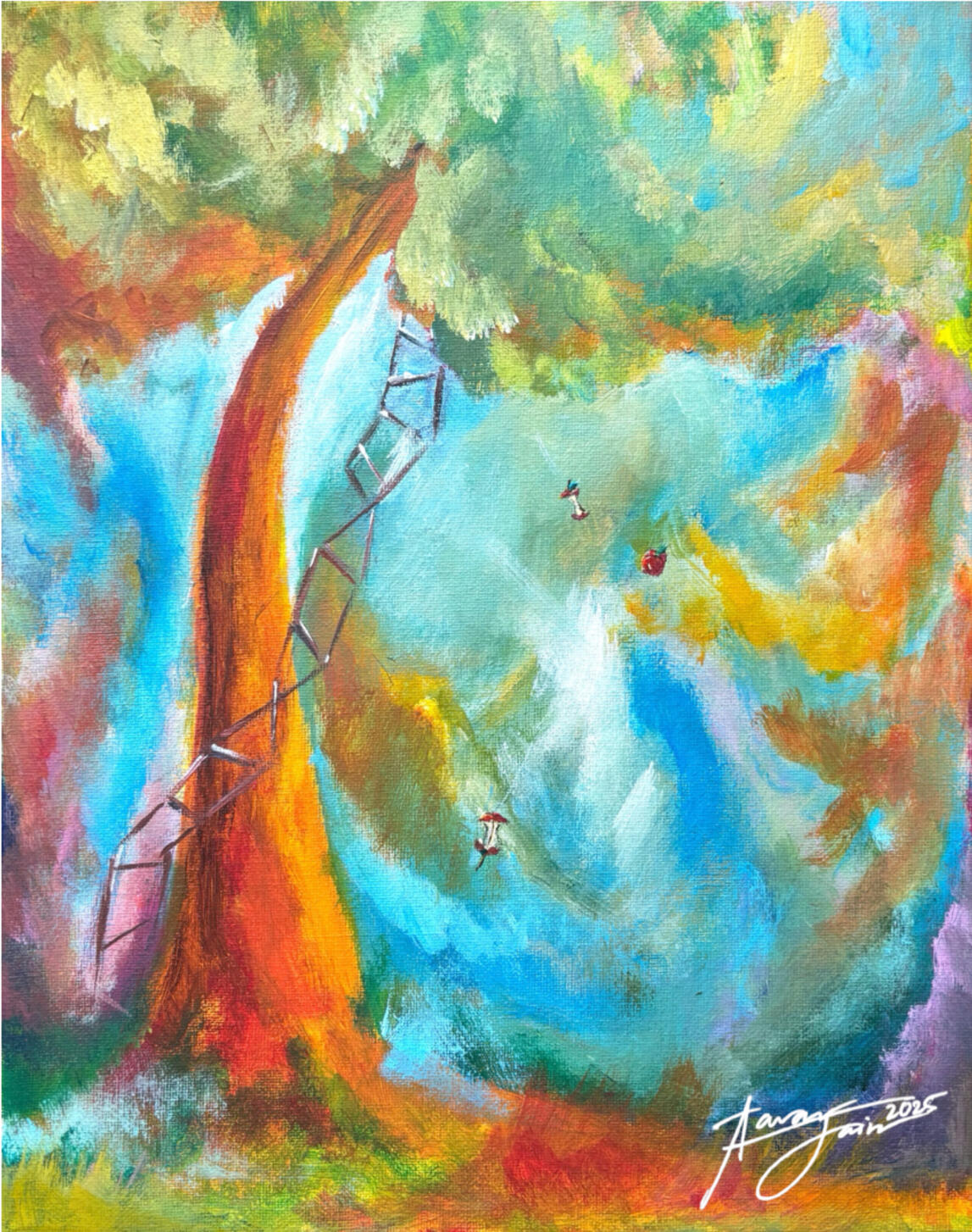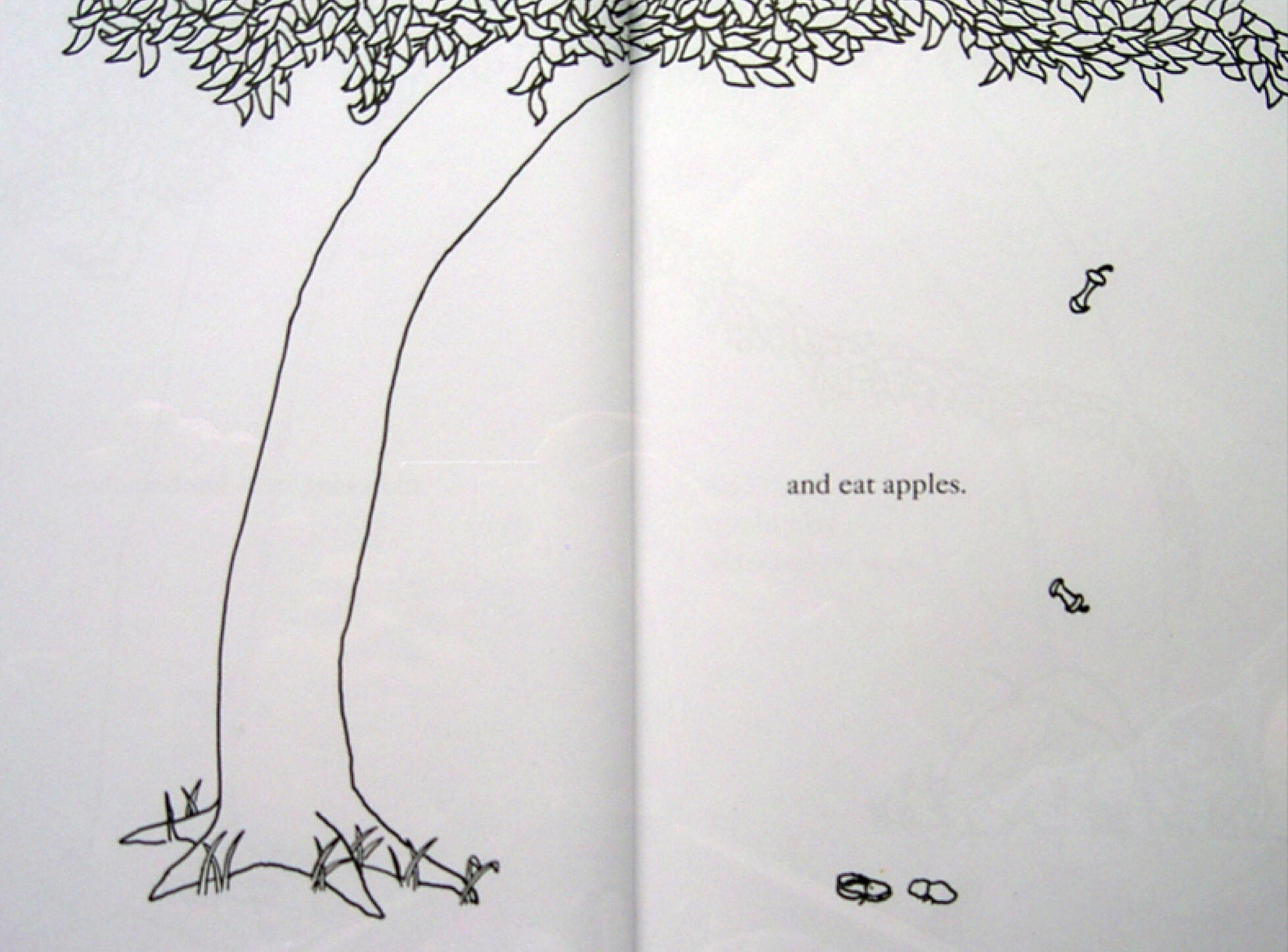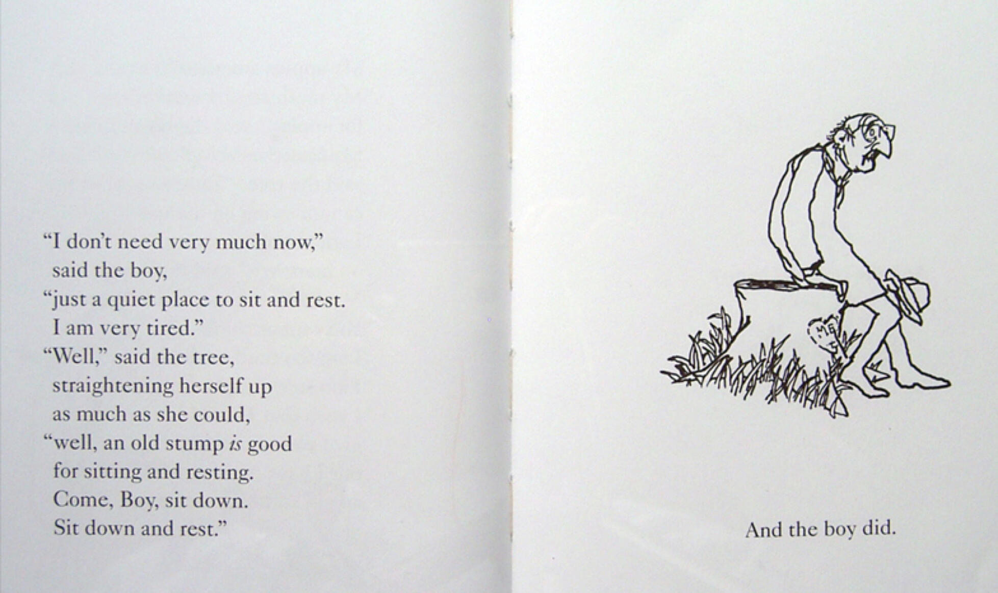 Oftentimes the simplest things hold the deepest meaning. If you’re unsure, read The Giving Tree by Shel Silverstein. When I first read it, at around 5 or 6 years old, the appeal was obvious. It had a bright-green cover, cool illustrations, and straightforward writing that invited the young me to flip each page and fly through the book. However, it always left me unsettled by the seemingly sad ending. The tree was gone and the boy was old. But I was young, and naive, and never spared the book a second thought.Exactly 10 years later, I was drawing the design for another artwork—The Ascent—and had to include a few childhood books to illustrate the beginning of my reading journey, including the nostalgic book by Silverstein. Only then did I return to resolve the unsettling ending and by the end of reading it again, it felt like I had read a new book altogether. Each drawing spoke volumes in its subtlety, as did the painfully straightforward plot. Seriously, the final image of The Giving Tree may well be the most powerful reading experience I’ve ever had. Preserving a reminder of this beauty in a painting was reason enough to paint.From this newfound discovery of depth, I set out to paint two scenes to summarize my takeaway from the book:1) The Giving Tree: The first scene is inspired by the early, idyllic stages of The Giving Tree. The boy plays freely, swinging from the branches and eating apples, unburdened by the impurities of society. The tree observes with a more mature contentment. Silverstein’s image below was the direct inspiration of my design, with the subtlety of fallen apple cores conveying the story adequately. The rope ladder suspends, bearing traces of the upward reaching climb in The Ascent. When we look back someday, this painting should symbolize the “Good Old Days.”