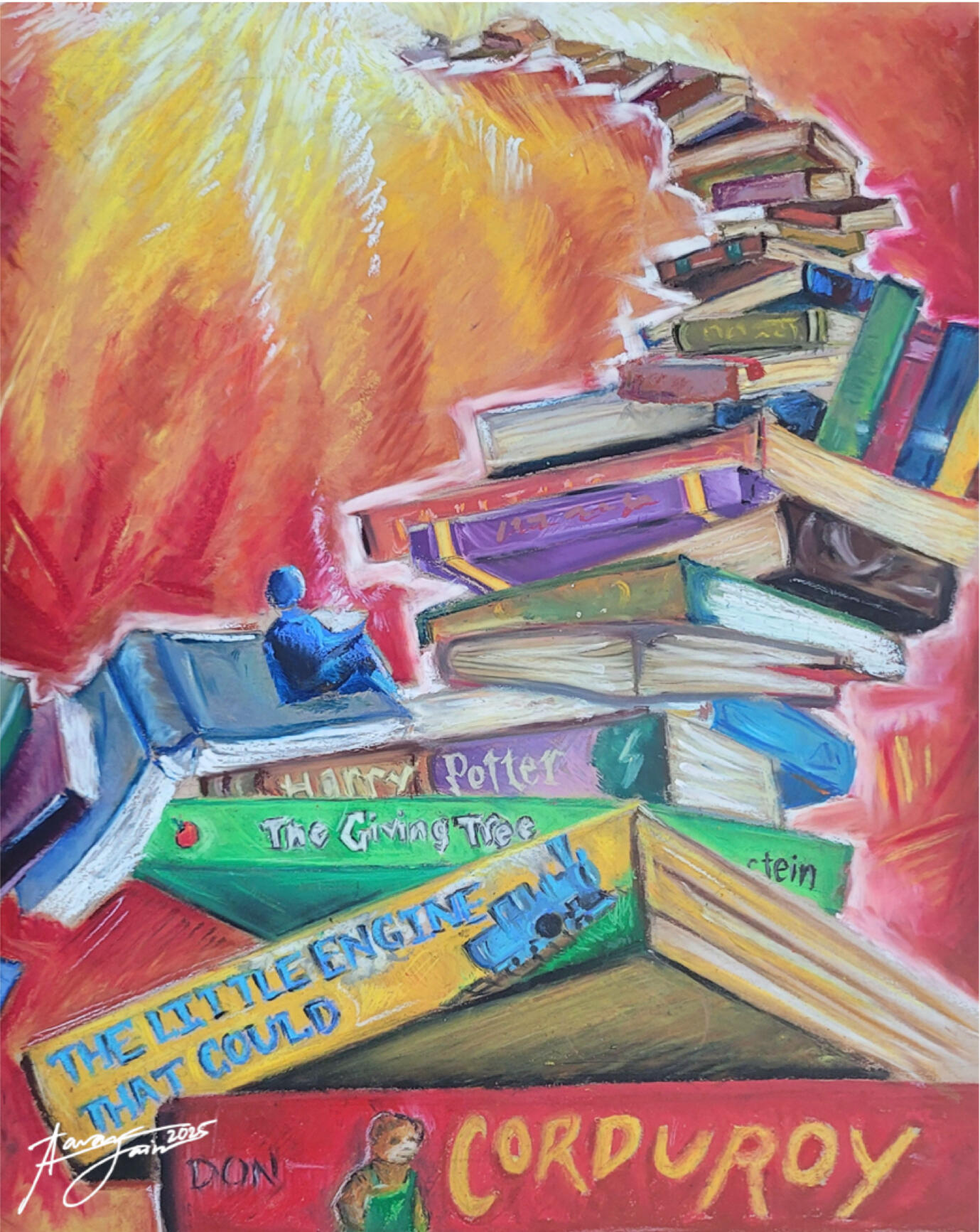The visual of an uphill journey has always inspired me towards action. The Greek mythological figure Sisyphus was eternally cursed to push a boulder to the top of a hill each day, only for it to come tumbling down the hill by the next. Famously, the French philosopher Albert Camus redefined Sisyphus’ efforts as purely fulfilling, even if it bore no practical result and demanded eternal struggle. Since then, the concept of upward struggle has motivated my own pursuits.One such pursuit, as depicted in The Ascent, is the intellectual journey towards wisdom, truth, and maturity. The very action of reading and consuming knowledge always feels rewarding, regardless again of the practical result. Thus, the object of my work was to remind myself of this noble but difficult journey in the hopes of undertaking it more consistently.The childhood books mark an introduction to reading and learning. Corduroy is the first book I remember reading and slowly but surely, my selection grew. The Little Engine That Could is a timeless reminder of motivation and The Giving Tree, while defined as a childhood book by nature of its simplicity, felt infinitely more meaningful when I revisited it about a decade later. The legible titles end pretty low on the bookstack. This is partly because I couldn’t add small enough lettering to the small books and partly because I don’t know what exists higher up.Broadly speaking, the bookstack’s design subtly resembles the shape of a question mark. Especially in learning, curiosity is a prerequisite. The top of the bookstack disappears into a brilliant explosion of light—symbolic of the enlightenment or clarity gained through learning. Today, I am reading Crime and Punishment by Dostoevsky, which is quite a ways away from Corduroy only some years ago. One day, I hope to be further along this metaphorical staircase, absorbing deeper truths with deeper sincerity. But regardless, it is the very intent to seek higher meaning that makes us human. The fact that we make the conscious decision to ascend the staircase is enough. As Camus wrote, “One must imagine Sisyphus happy.”