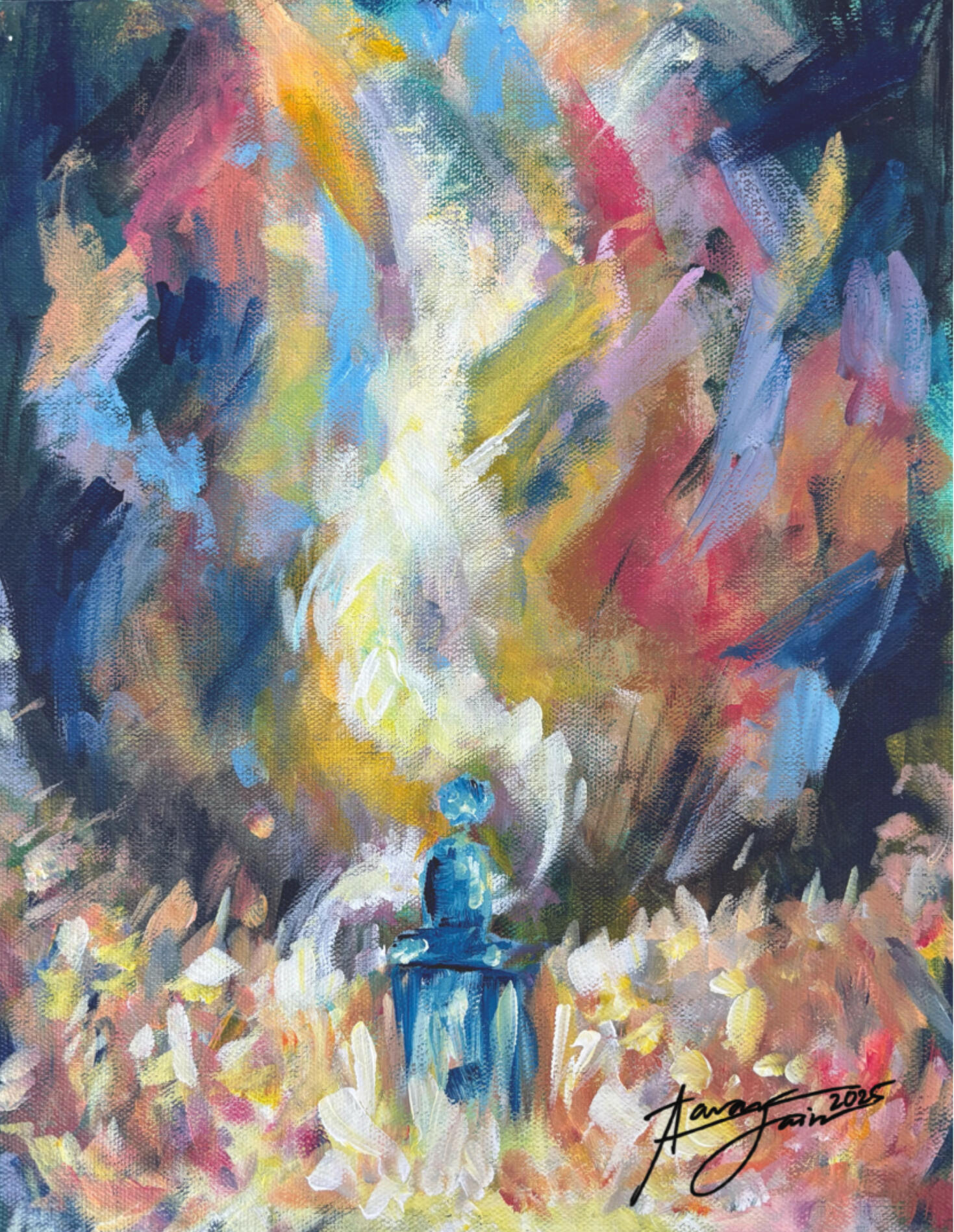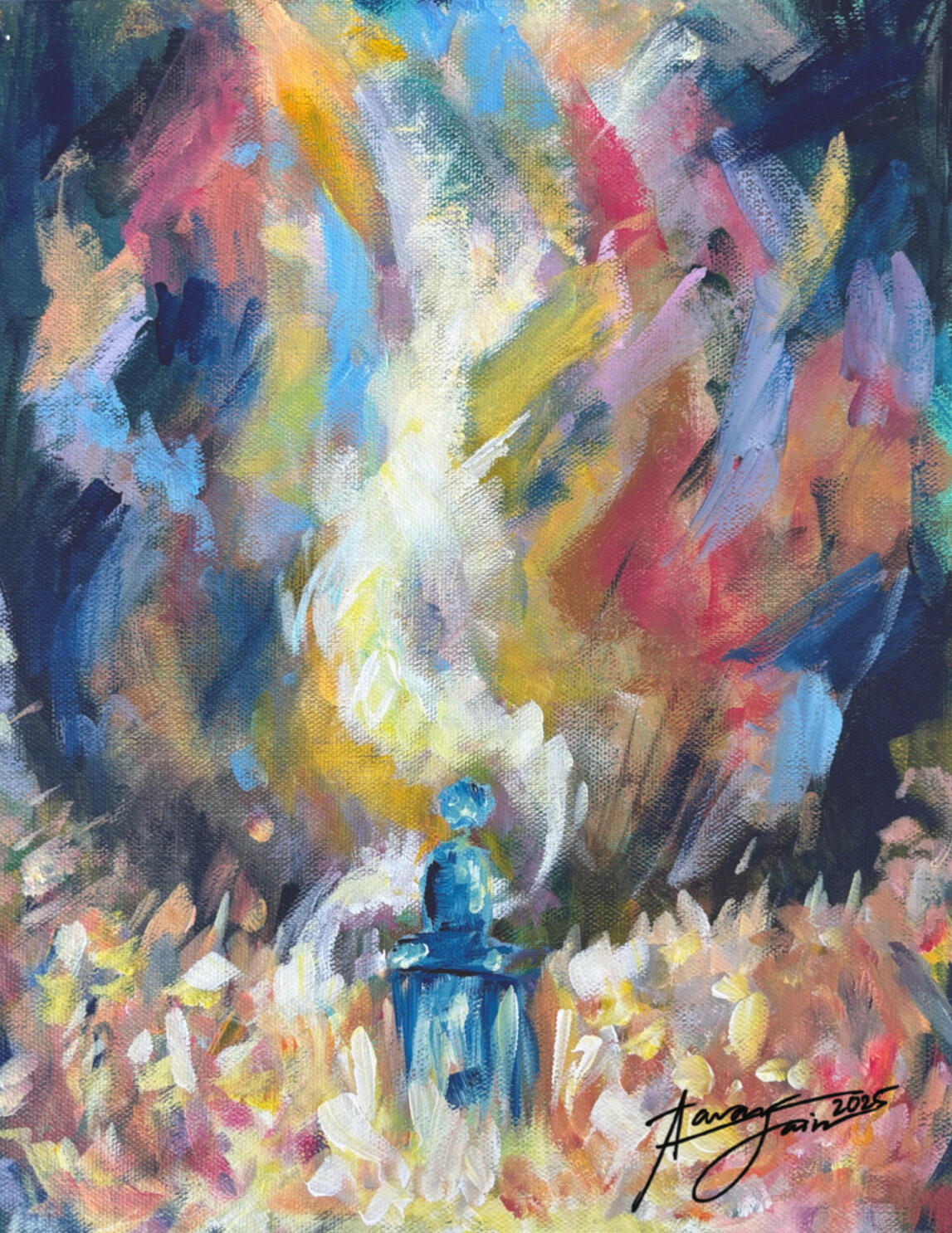 To my chagrin, I have found inspiration to be a very fickle thing. Which like the moon, waxes and wanes. Inspiration flows unrestrainably at night when I paint, read, and write poetry. Then I wake up and my poems don’t make sense. Sometimes I feel determined to do cardio or lift weights and when the time comes, the motivation is gone. If there is anyone who is not subject to the rise and fall of inspiration, I would love to meet that person.My work, therefore, is symbolic of the flow of inspiration. I picture inspiration to be a waterfall, originating from an external source in arbitrary spurts—much like the idea of cupid shooting his arrows of love. And in the same way love unexplainably grips the mind, inspiration strikes at an untimely moment.Inspiration also, is so abstract and intangible. But inevitably, psychologists or neuroscientists will one day discover the true origin of it. And then, the mystery of inspiration will be resolved by some sort of chemical reaction. Before this day, though, we can enjoy the volatility of our inspiration and marvel at the mechanistic brain’s capability for feeling in the most abstract, delicate, and beautiful ways. The capability to love is more than likely a science. But for those who have been overwhelmed by a feeling of love, it feels so much more than a science. I say it is humanity: the feverish, middle-ground between knowing and not-knowing.So until the day when inspiration is diminished to microscopic activity in some unassuming pocket of our brain, I savor its moments and daily hope for its return. And through a painting made by the grace of inspiration, I can memorialize the beautiful enigma of such moments.
