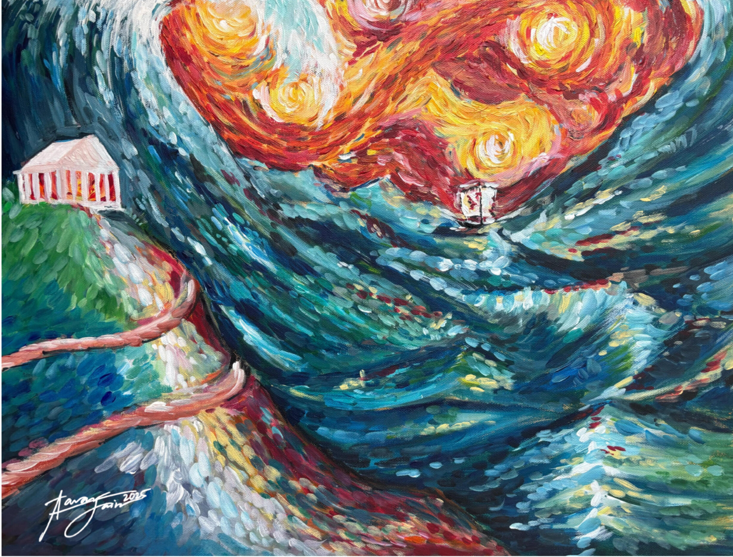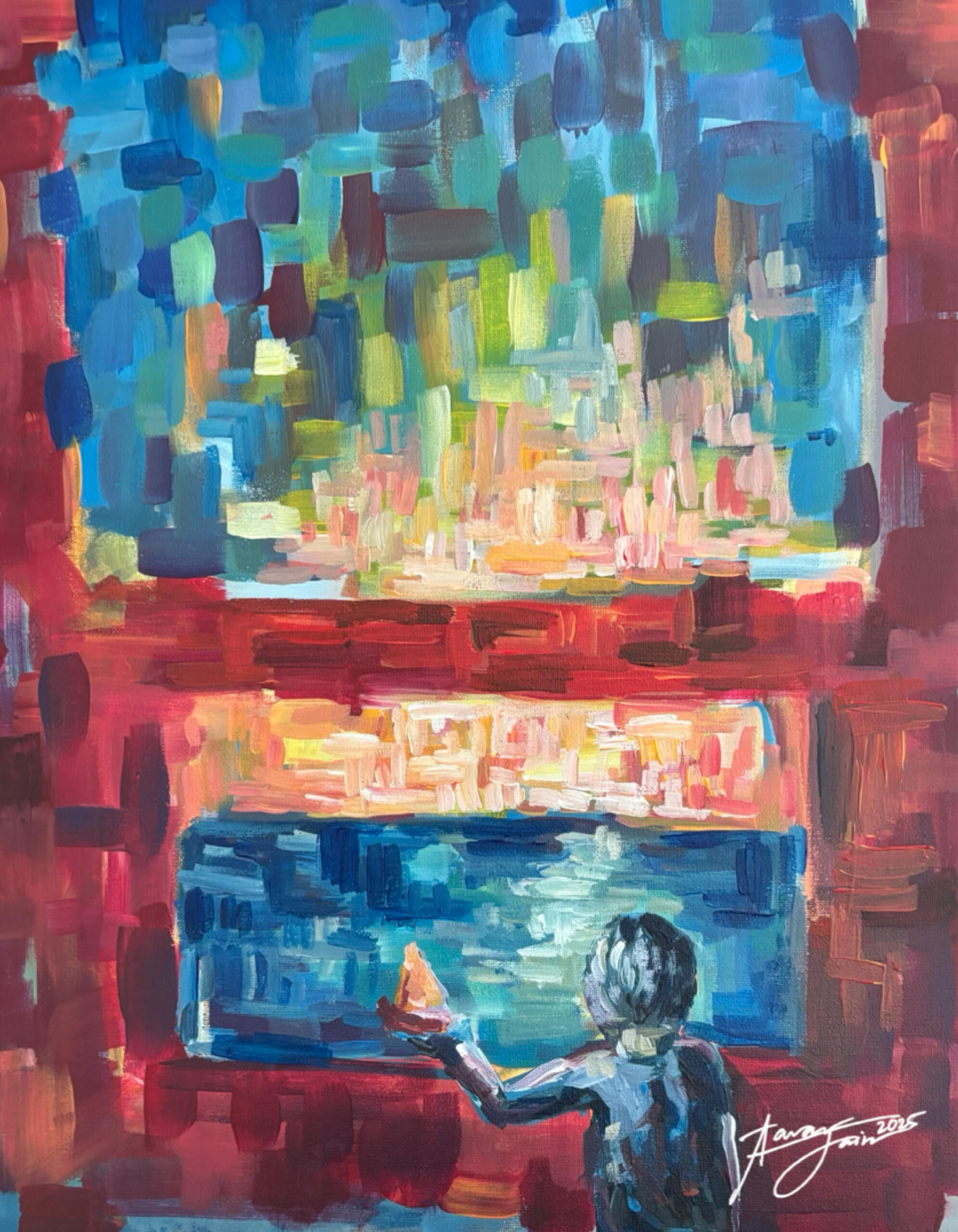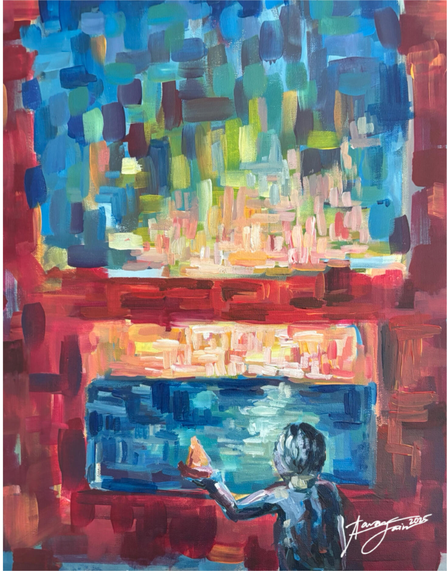 The idea of this painting is to communicate the dichotomy between youthful innocence and a cutthroat world. Children, in their curiosity, make toy ships. But soon, they’ll learn to design real ships to weather life’s storms. Both have beauty: the magnificence of the sea and the obliviousness of the child.A brilliant expression of this concept comes from JD Salinger’s book The Catcher in the Rye. When the main character finds himself out of place in school and the superficial, disingenuous world surrounding him, he dissolves into what may appear as insanity. Still, when asked what the purpose of life is, his example resounds with clarity. He says that in a perfect world, he would like to live on a rye, where children play freely. And if they ever fall off the cliff, he would like nothing more than to catch them. This gives the book its title: The Catcher in the Rye. Too often are the sparks of youth extinguished by the dullness of the real world.But perhaps, with a little bit of intent, we can rekindle the brilliance of our truest curiosities and passions. Sometimes, we take life for granted: the joy of waking up, seeing the sun, driving to school or work. And too often, it’s only in hindsight that we enjoy these things. Starting with today, here is your reminder to experience the simplest joys of life in the most feverish ways. Become the child again.