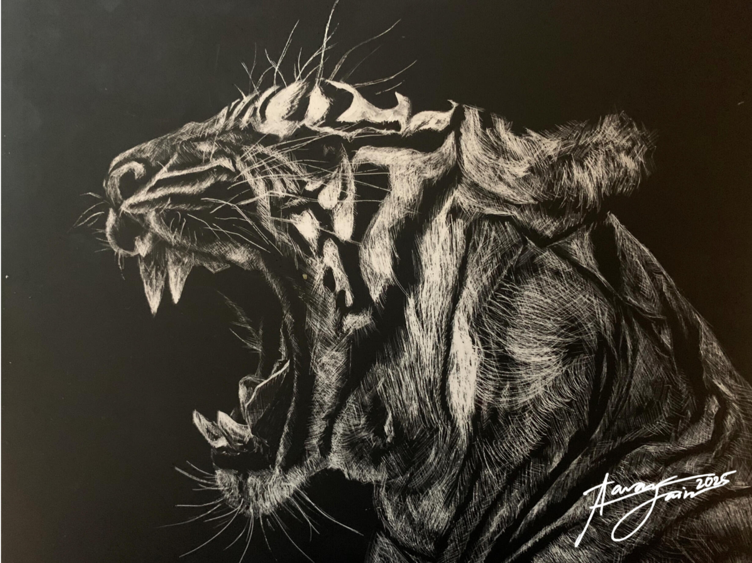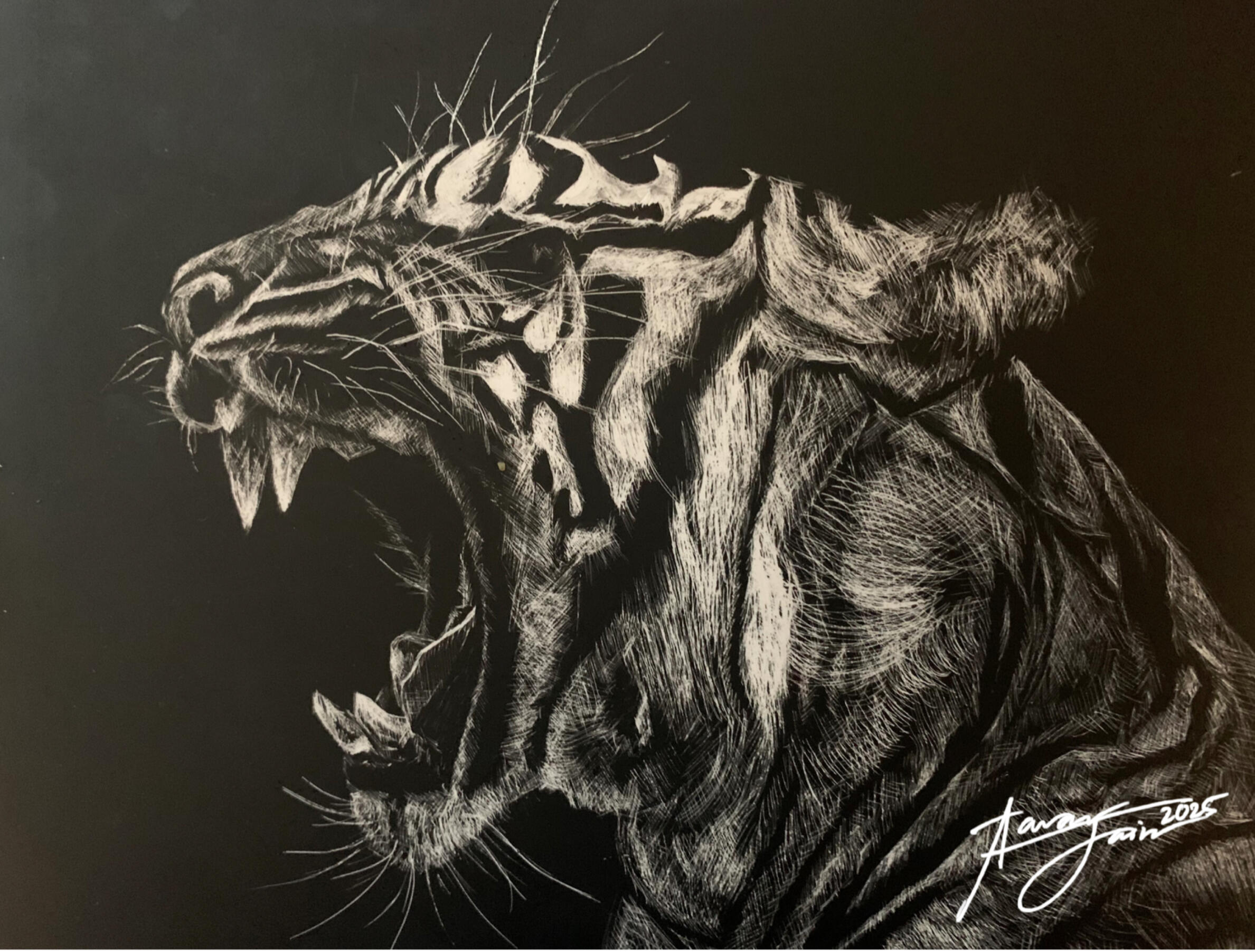 Scratchboard is the technique of etching/scratching white lines on a black board. As in the process of this art piece, tedious work persisted over time leads to good work.The image of a roaring tiger reminded me of William Blake’s famous poem, “Tyger Tyger”, which opens:Tyger Tyger, burning bright,